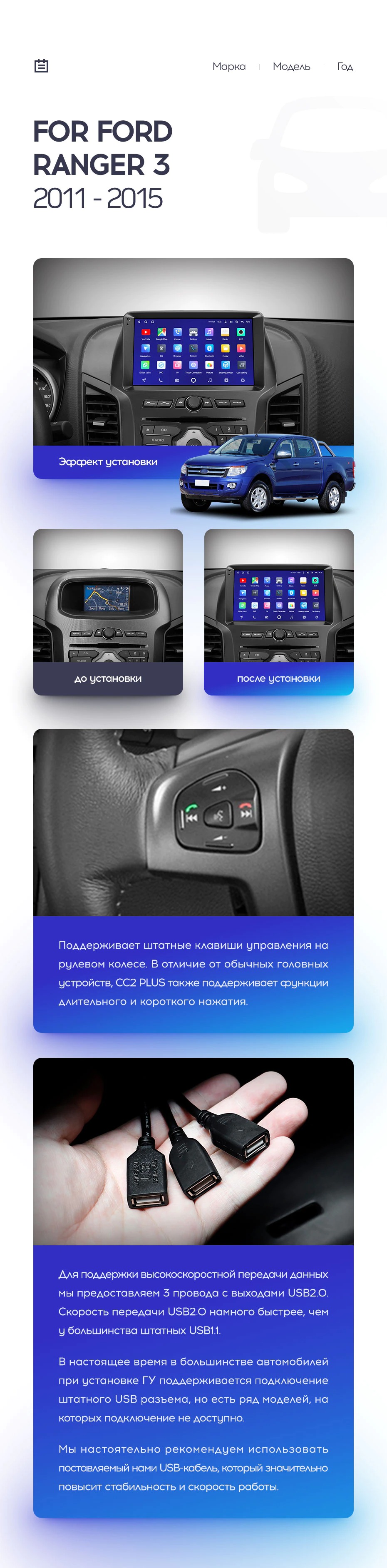 Полный комплект установки магнитолы Teyes с рамкой и проводкой можно выбрать в каталоге штатных магнитол Ford Ranger 3 (2011-2015).