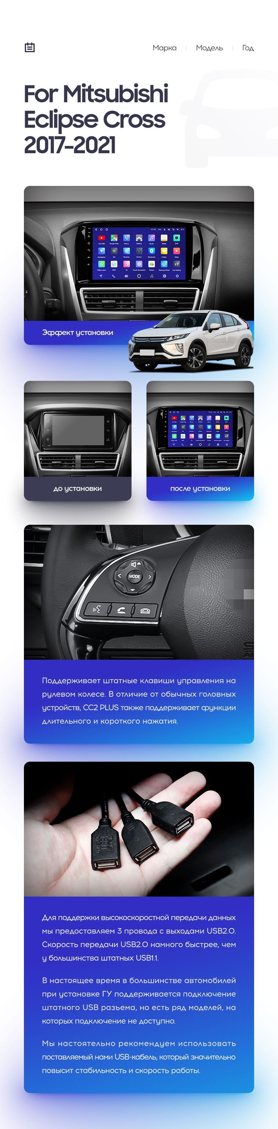Полный комплект установки магнитолы Teyes с рамкой и проводкой можно выбрать в каталоге штатных магнитол Mitsubishi Eclipse Cross (2017-2021).