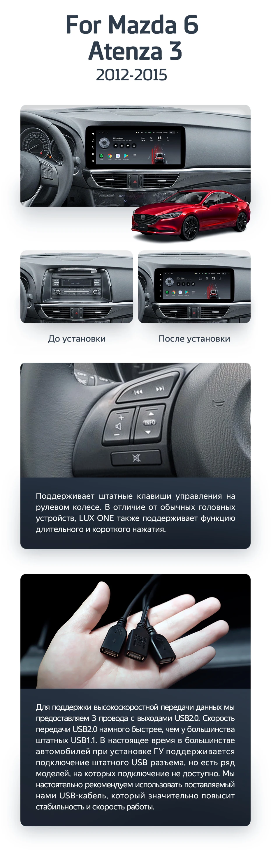 Полный комплект установки магнитолы Teyes с рамкой и проводкой можно выбрать в каталоге штатных магнитол Mazda 6 GJ (2012-2015).